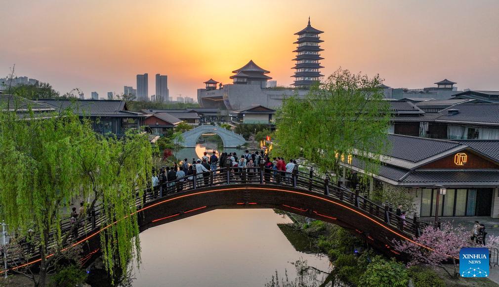 An aerial drone photo taken on April 4, 2026 shows tourists viewing sunset at a scenic area in Yangzhou, east China's Jiangsu Province. Qingming Festival, or Tomb-Sweeping Day, falls on April 5 this year. It is a traditional Chinese festival for people to pay tribute to the dead and worship their ancestors. The holiday also provides a short break for Chinese citizens as they engage in outdoor activities and sightseeing. (Photo by Qi Liguang/Xinhua)