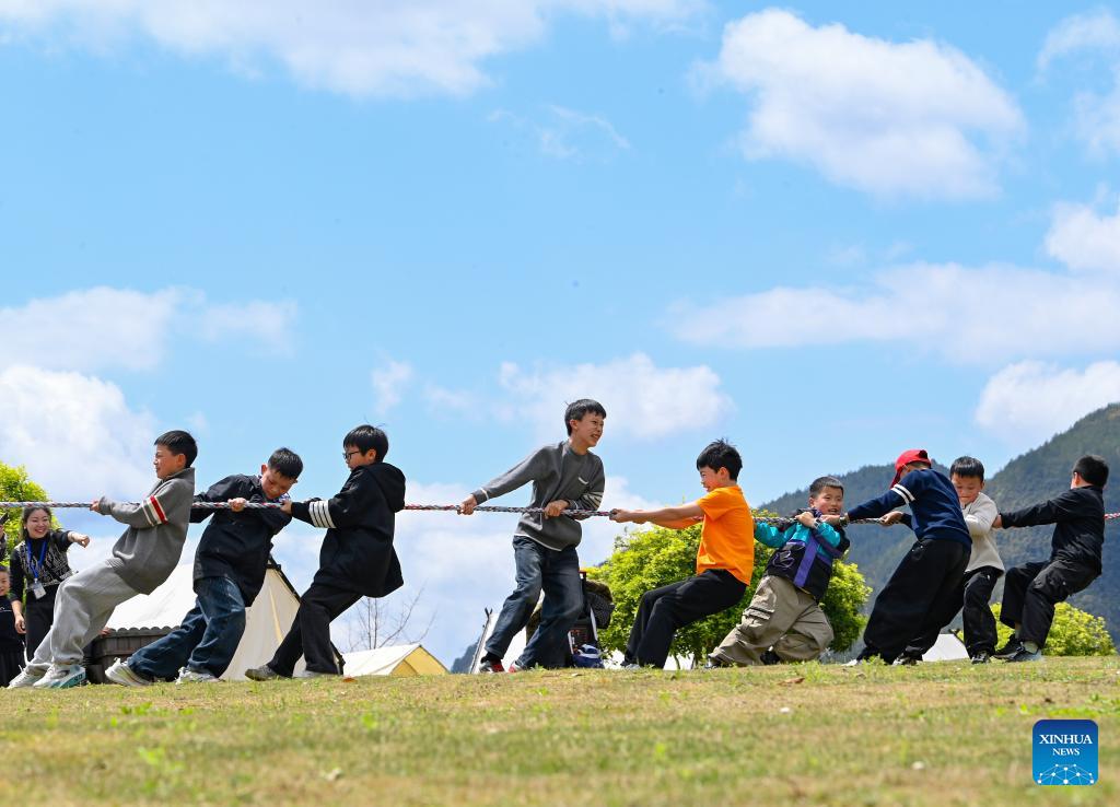 Children play a tug-of-war game at Dieshihuagu scenic area in Youyang Tujia and Miao Autonomous County, southwest China's Chongqing Municipality, April 3, 2026. Qingming Festival, or Tomb-Sweeping Day, falls on April 5 this year. It is a traditional Chinese festival for people to pay tribute to the dead and worship their ancestors. The holiday also provides a short break for Chinese citizens as they engage in outdoor activities and sightseeing. (Photo by Ran Chuan/Xinhua)