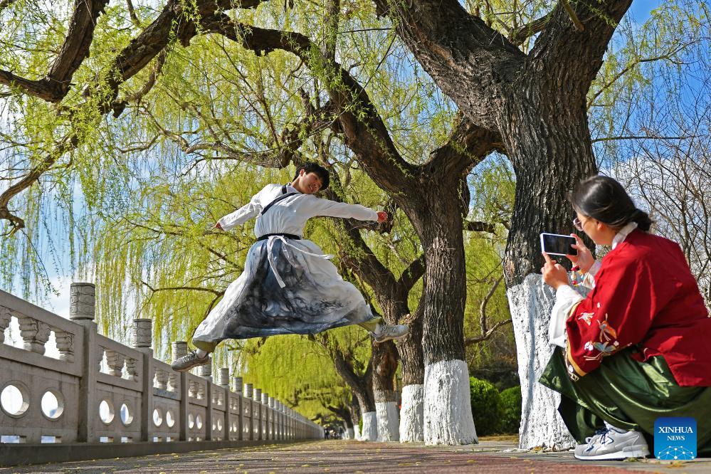 Tourists in traditional Chinese attire enjoy leisure time in Zouping, east China's Shandong Province, March 31, 2026. Qingming Festival, or Tomb-Sweeping Day, falls on April 5 this year. It is a traditional Chinese festival for people to pay tribute to the dead and worship their ancestors. The holiday also provides a short break for Chinese citizens as they engage in outdoor activities and sightseeing. (Photo by Dong Naide/Xinhua)