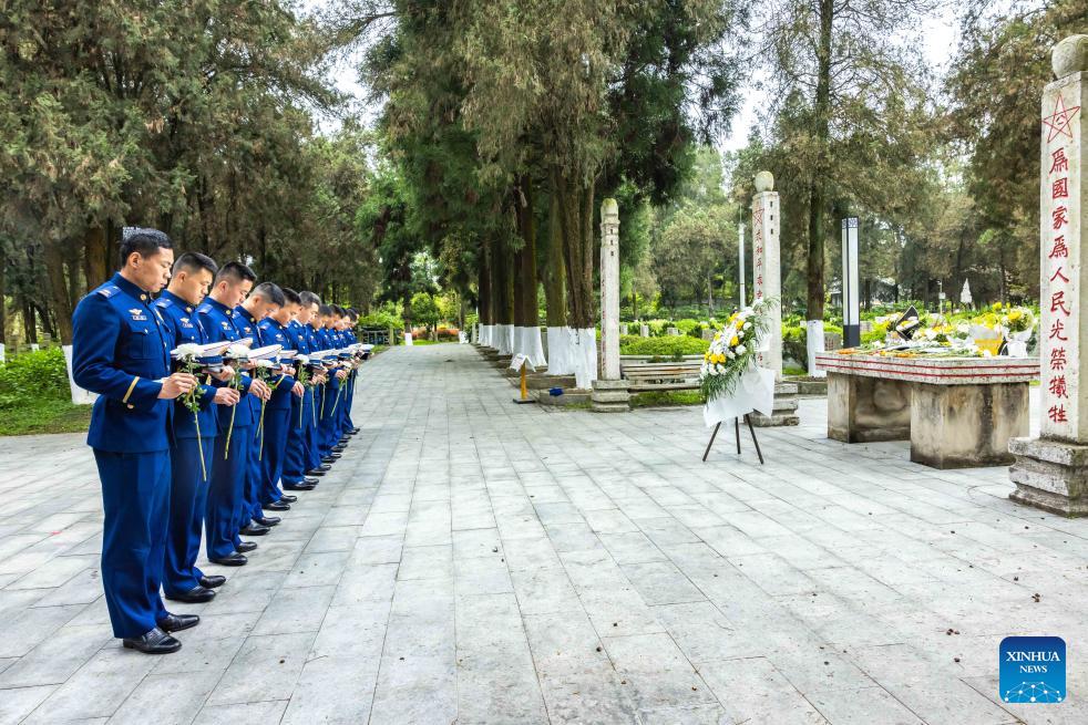 People pay tribute to martyrs at a martyrs' cemetery in Anshun City, southwest China's Guizhou Province, April 5, 2026. People across the country attended various activities to pay tribute to martyrs during the Qingming Festival, or Tomb-Sweeping Day, on Sunday this year. (Photo by Chen Xi/Xinhua)