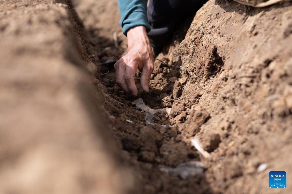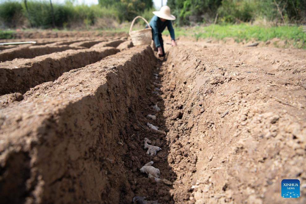 A farmer plants white gingers in a field in Datong Town of Tongling, east China's Anhui Province, on April 5, 2026. Around the Qingming Festival, farmers in Tongling are busy ridging fields, planting white ginger, applying fertilizer, and building ginger sheds.