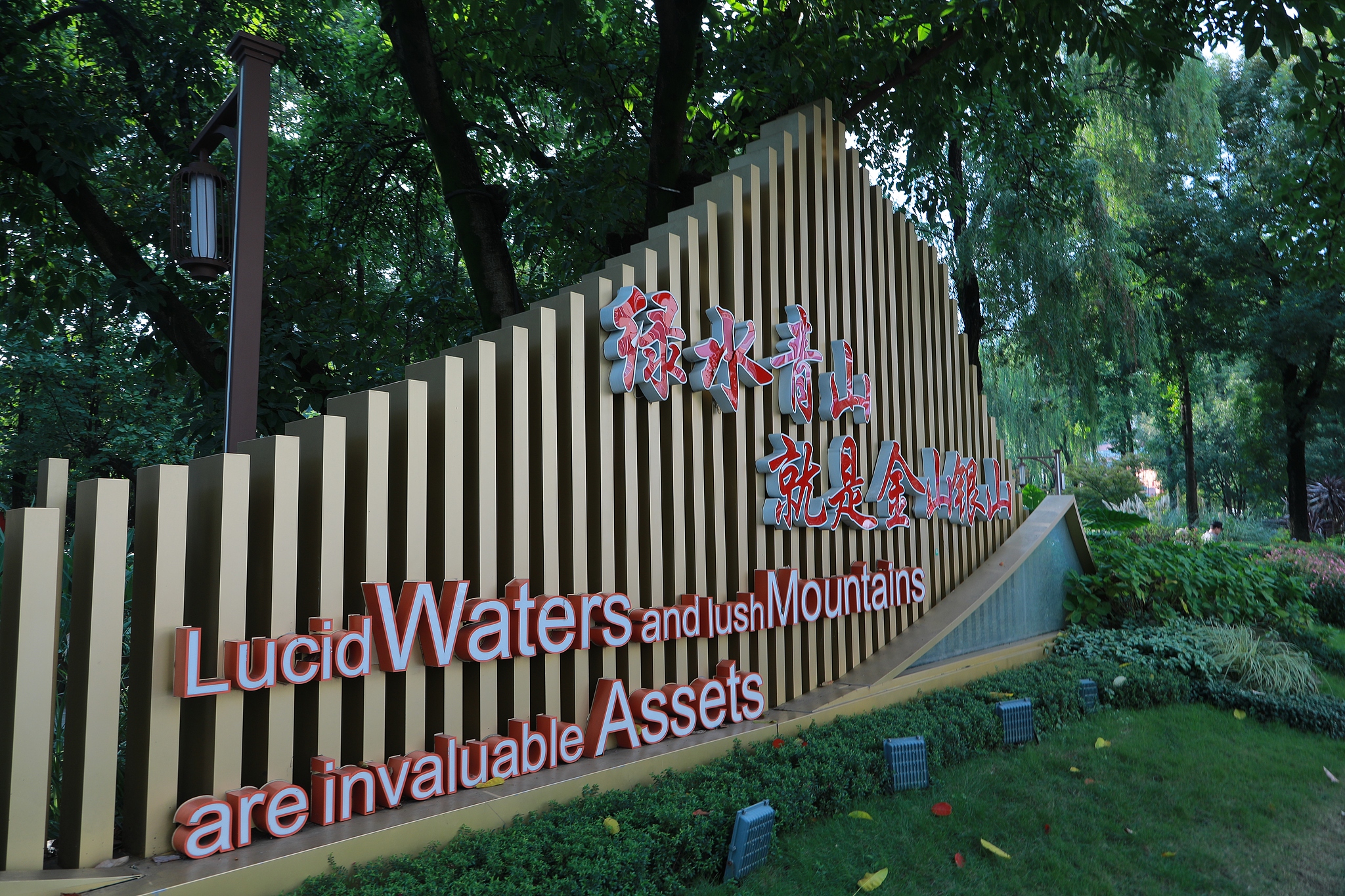 The concept of "lucid waters and lush mountains are invaluable assets" is written on a board at 2024 Chengdu International Horticultural Exhibition, Chengdu, Sichuan Province, China. /VCG
