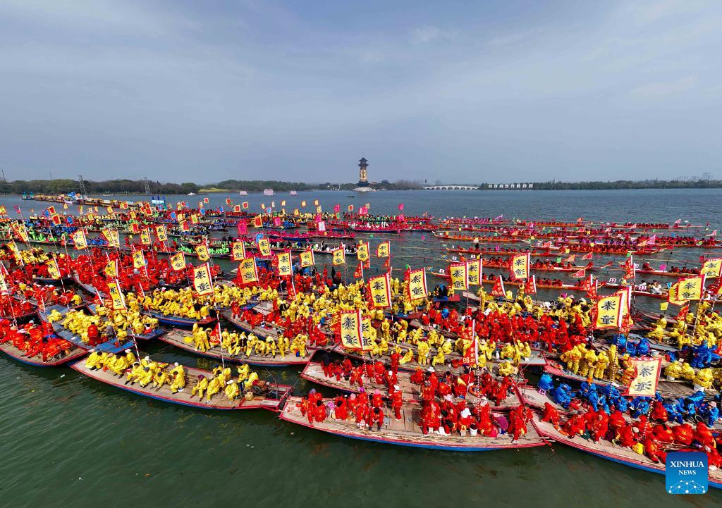 A drone photo taken on April 6, 2026 shows boats competing during the Qintong Boat Festival held at the Qinhu National Wetland Park in Qintong Town of Taizhou City, east China's Jiangsu Province. Originating in ancient China's Southern Song Dynasty (1127-1279), the Qintong Boat Festival has been said to be held in memory of ancestors and ancient heroes. Hundreds of boats with more than 10,000 polers aboard gathered here on Monday for this year's festival, during which each boat competed in a speed challenge. This centuries-old grand water festival was listed as one of the country's national intangible cultural heritages. (Photo by Tang Dehong/Xinhua)