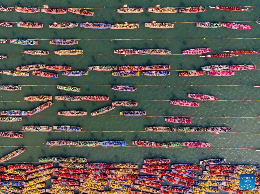 A drone photo taken on April 6, 2026 shows boats getting ready to take part in the Qintong Boat Festival held at the Qinhu National Wetland Park in Qintong Town of Taizhou City, east China's Jiangsu Province. Originating in ancient China's Southern Song Dynasty (1127-1279), the Qintong Boat Festival has been said to be held in memory of ancestors and ancient heroes. Hundreds of boats with more than 10,000 polers aboard gathered here on Monday for this year's festival, during which each boat competed in a speed challenge. This centuries-old grand water festival was listed as one of the country's national intangible cultural heritages. (Photo by Yang Yugang/Xinhua)