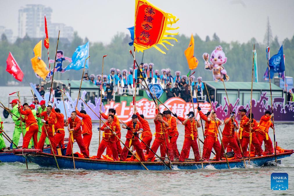 Boatmen pole boats forward to compete during the Qintong Boat Festival held at the Qinhu National Wetland Park in Qintong Town of Taizhou City, east China's Jiangsu Province, on April 6, 2026. Originating in ancient China's Southern Song Dynasty (1127-1279), the Qintong Boat Festival has been said to be held in memory of ancestors and ancient heroes. Hundreds of boats with more than 10,000 polers aboard gathered here on Monday for this year's festival, during which each boat competed in a speed challenge. This centuries-old grand water festival was listed as one of the country's national intangible cultural heritages. (Photo by Tang Dehong/Xinhua)