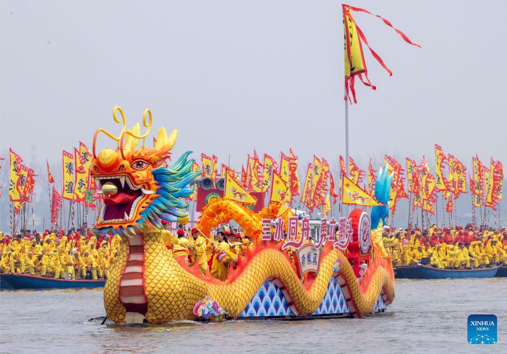 A dragon boat takes part in the Qintong Boat Festival held at the Qinhu National Wetland Park in Qintong Town of Taizhou City, east China's Jiangsu Province, April 6, 2026. Originating in ancient China's Southern Song Dynasty (1127-1279), the Qintong Boat Festival has been said to be held in memory of ancestors and ancient heroes. Hundreds of boats with more than 10,000 polers aboard gathered here on Monday for this year's festival, during which each boat competed in a speed challenge. This centuries-old grand water festival was listed as one of the country's national intangible cultural heritages. (Photo by Tang Dehong/Xinhua)