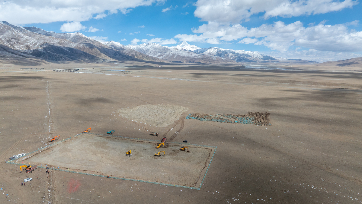 A drone photo taken on April 6, 2026 shows the scene of groundbreaking of a 50 MW trough-based concentrated solar power plant by China General Nuclear Power Group in Damxung county of Lhasa, Southwest China's Xizang autonomous region. (Photo: Xinhua)