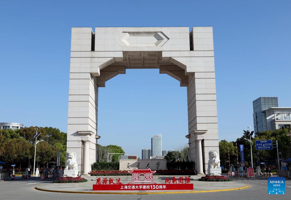 This photo taken on April 8, 2026 shows an installation marking the 130th anniversary of Shanghai Jiao Tong University (SJTU) in front of a gate of its Minhang campus in Shanghai, east China.
