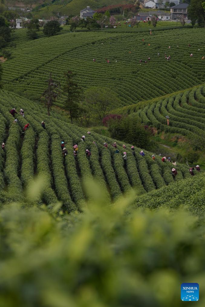This photo taken on April 8, 2026 shows workers picking tea leaves at a tea garden in Anji County, east China's Zhejiang Province. The white tea in Anji County has currently entered its harvest season. In 2025, the output of white tea in Anji reached 2,630 tonnes, with an annual output value of the tea industrial chain exceeding 7 billion yuan (about 1.02 billion U.S. dollars). The county also recorded more than 5 million tea-related tourist trips last year. (Xinhua/Huang Zongzhi)