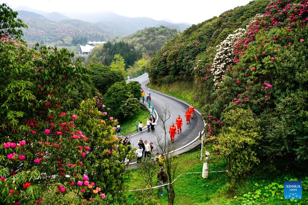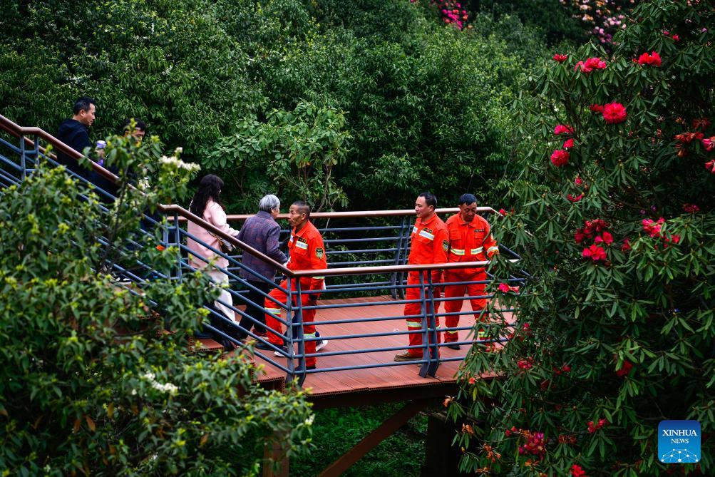 Forest rangers patrol at Baili Azalea Nature Reserve in Bijie City, southwest China's Guizhou Province, April 2, 2026. Every year, the peak bloom of the azaleas marks the busiest time for the forest rangers of Baili Azalea Nature Reserve. With tens of thousands of tourists come here every day to enjoy flowers and sightseeing, forest fire hazard prevention has become the top priority of rangers' daily work. (Xinhua/Yang Wenbin)