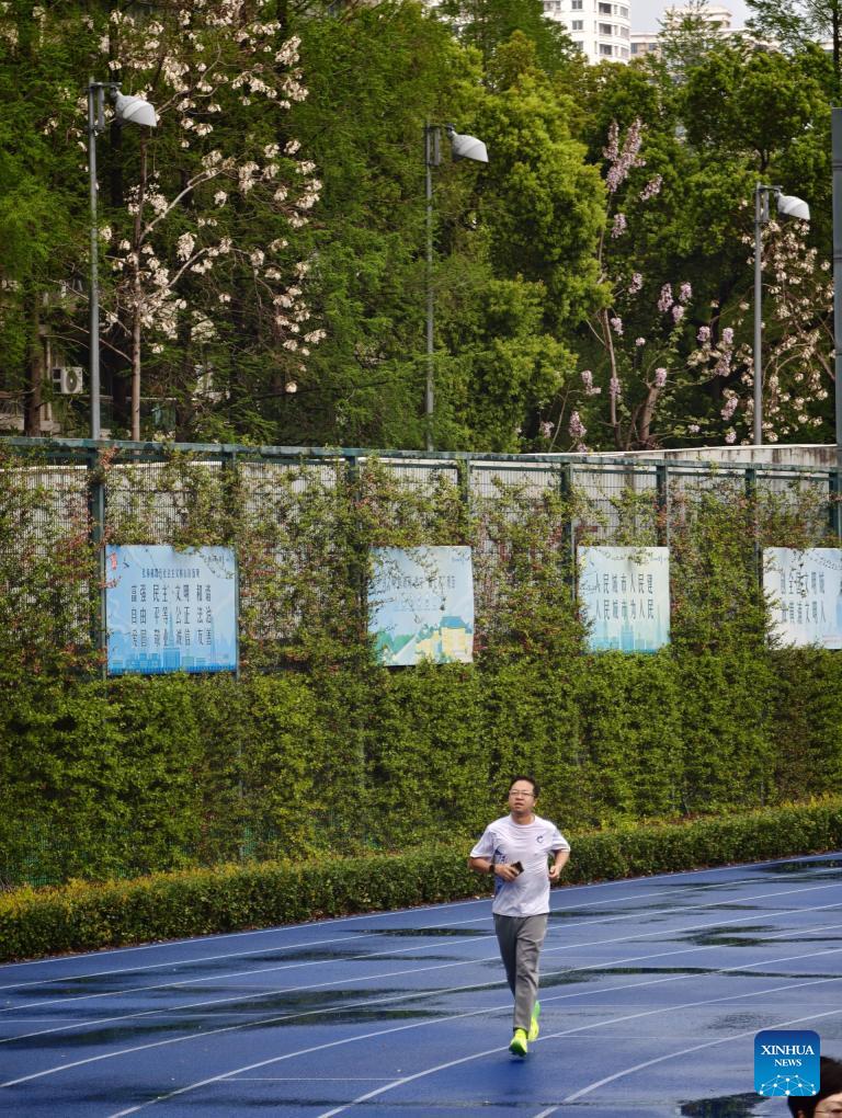 A man jogs at the Luwan Stadium in east China's Shanghai, April 9, 2026. (Xinhua/Xing Guangli)