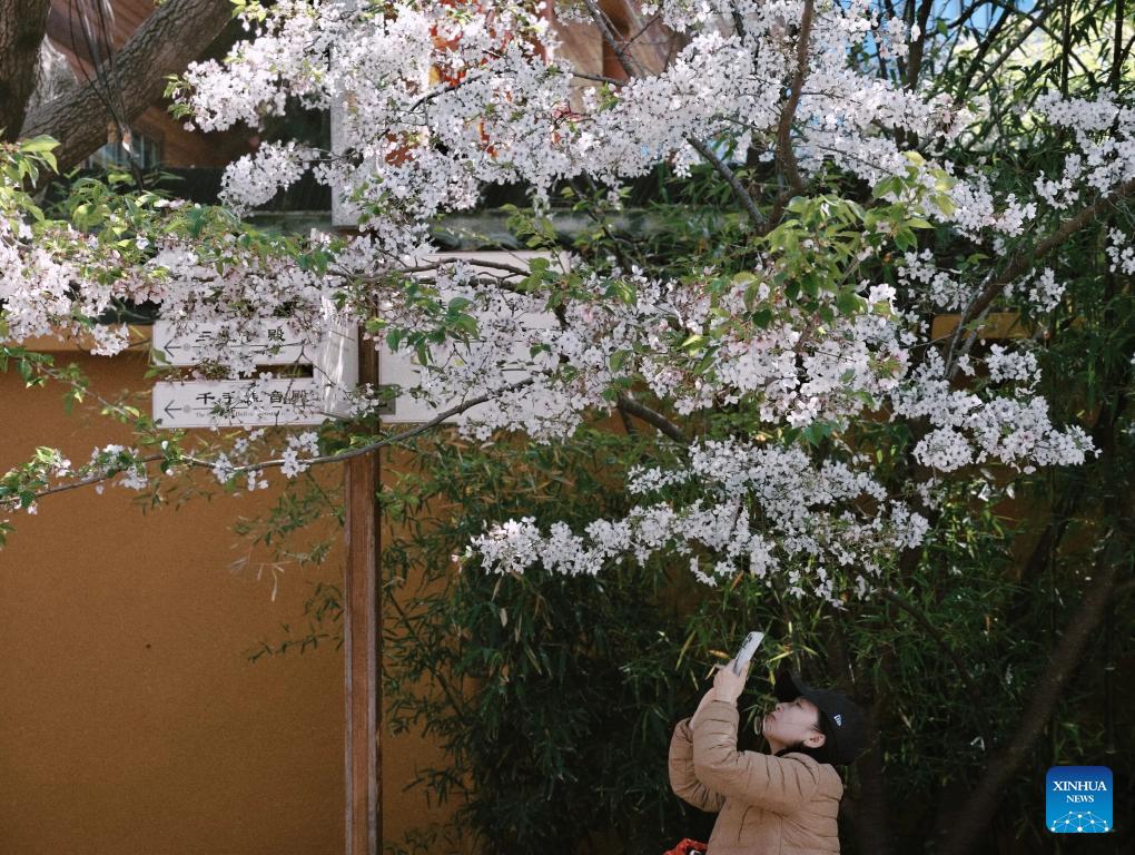 A woman takes photos of blossoms in east China's Shanghai, April 7, 2026. (Xinhua/Xing Guangli)