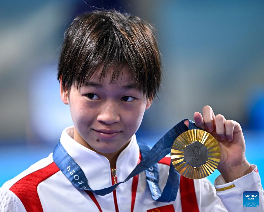 Gold medalist Quan Hongchan of China poses for photos during the awarding ceremony after the women's 10m platform final of diving at the Paris 2024 Olympic Games in Saint-Denis, France, Aug. 6, 2024. (Photo: Xinhua)