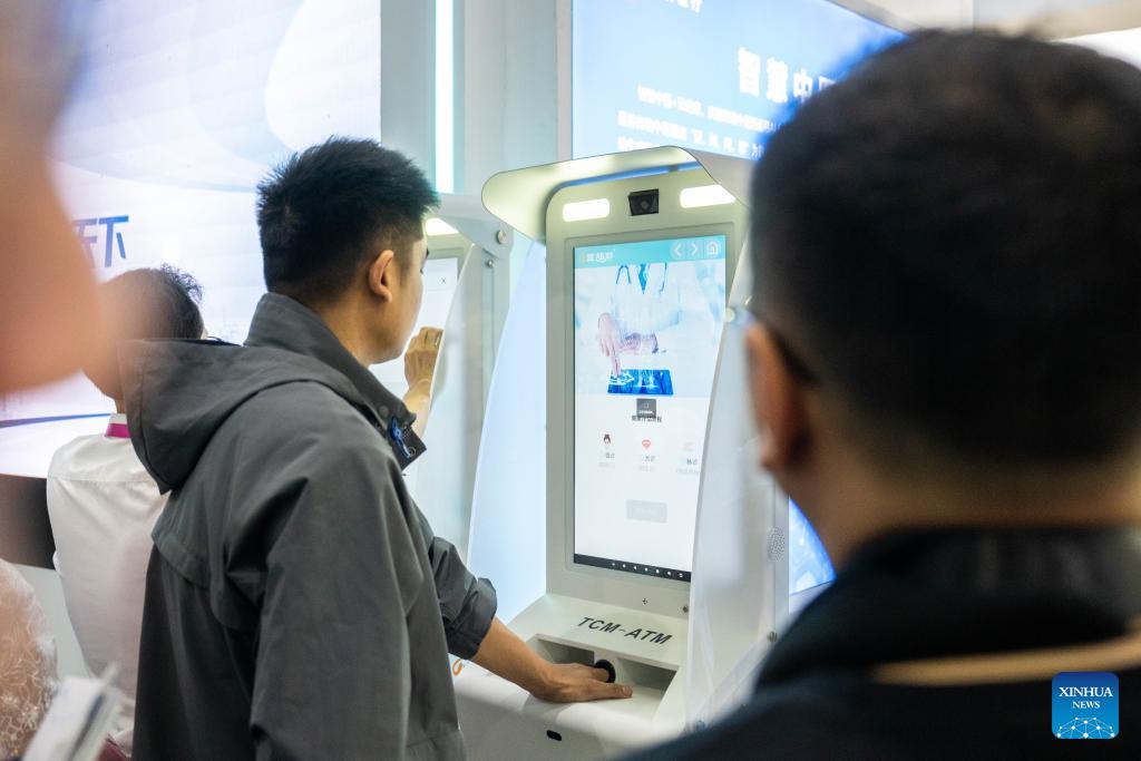 A visitor learns about an intelligent diagnosis device at the Chinese Medicine Agriculture Expo at Hunan International Convention and Exhibition Center in Changsha, central China's Hunan Province, April 10, 2026. With a total exhibition area of 20,000 square meters, the first edition of the Chinese Medicine Agriculture Expo kicked off here on Friday, bringing together over 300 exhibitors from across the country. (Xinhua/Chen Sihan)