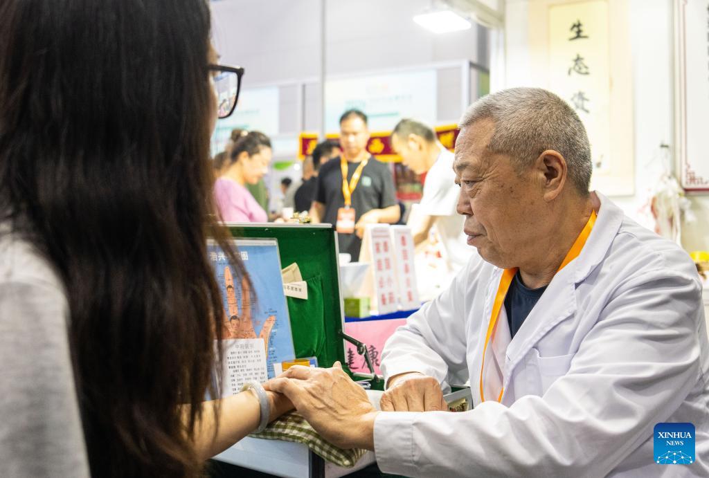A Traditional Chinese Medicine doctor performs pulse diagnosis for a visitor at the Chinese Medicine Agriculture Expo at Hunan International Convention and Exhibition Center in Changsha, central China's Hunan Province, April 10, 2026. With a total exhibition area of 20,000 square meters, the first edition of the Chinese Medicine Agriculture Expo kicked off here on Friday, bringing together over 300 exhibitors from across the country. (Xinhua/Chen Sihan)