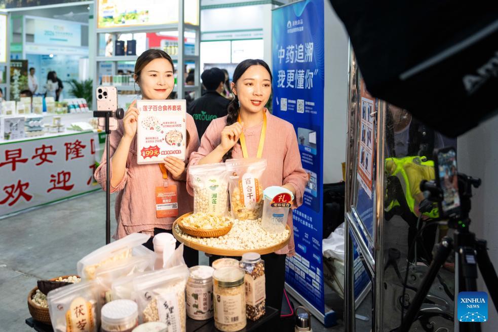 Exhibitors promote products via livestreaming at the Chinese Medicine Agriculture Expo at Hunan International Convention and Exhibition Center in Changsha, central China's Hunan Province, April 10, 2026. With a total exhibition area of 20,000 square meters, the first edition of the Chinese Medicine Agriculture Expo kicked off here on Friday, bringing together over 300 exhibitors from across the country. (Xinhua/Chen Sihan)