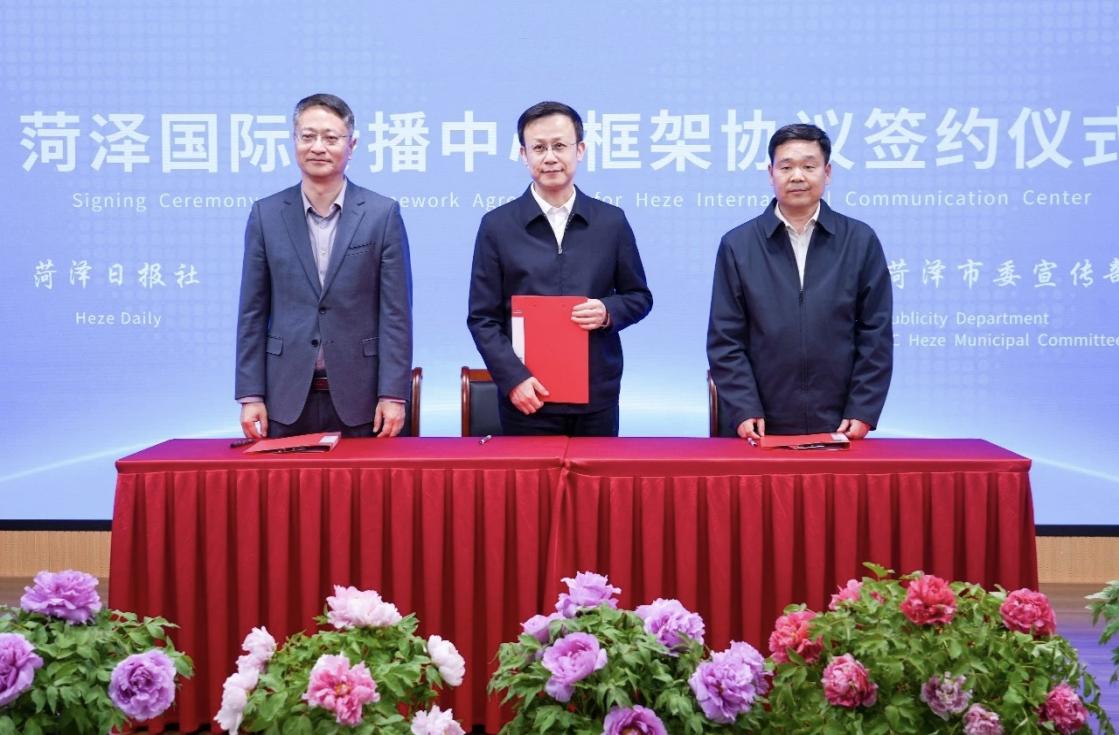 Heze authorities sign a framework agreement with the Business Development Department of China Daily at the inauguration ceremony of the Heze International Communication Center on April 10. (Photo via China Daily)