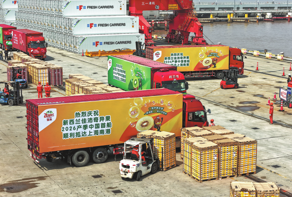The vessel Kehuai carrying over 4,000 metric tons of New Zealand kiwifruit docks at Shanghai's Nangang terminal on March 30, marking this year's first direct kiwifruit shipment from New Zealand to China. (Photo: China Daily)