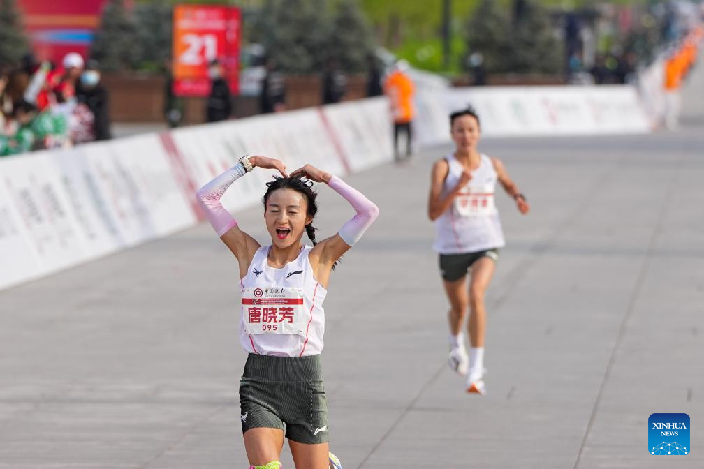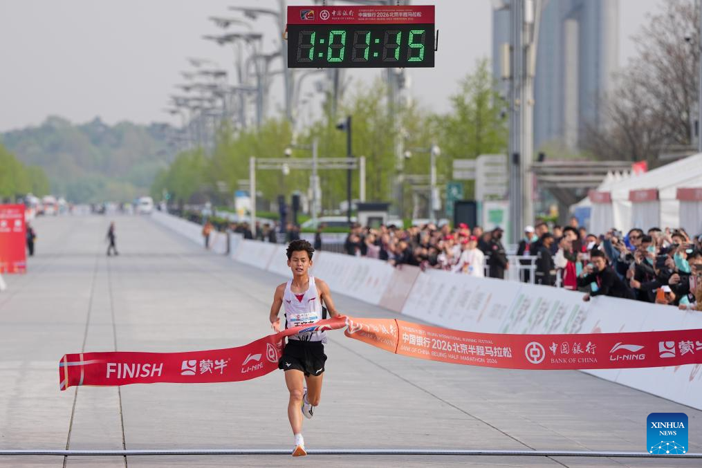 Wang Wenjie of China crosses the finish line to win the men's title during the Beijing Half Marathon 2026 in Beijing, capital of China, April 12, 2026. (Xinhua/Ju Huanzong)