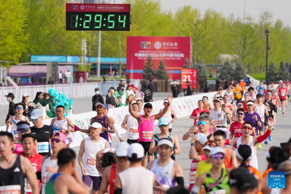 Participants cross the finish line during the Beijing Half Marathon 2026 in Beijing, capital of China, April 12, 2026. (Xinhua/Ju Huanzong)
