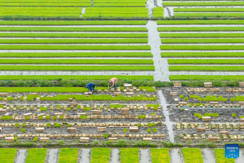An aerial drone photo taken on April 10, 2026 shows farmers transporting early-season rice seedlings in Shangtang Village of Huangjiabu Town, Yuyao, east China's Zhejiang Province. (Photo by Zhang Hui/Xinhua)