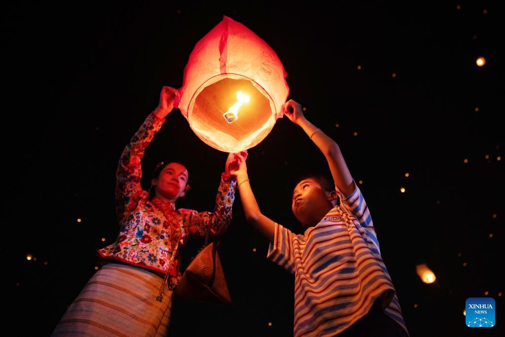 People fly Kongming lanterns, a kind of small hot-air paper balloon, by the Lancang River in Jinghong City, Xishuangbanna Dai Autonomous Prefecture, southwest China's Yunnan Province, April 13, 2026. (Xinhua/Jiang Wenyao)