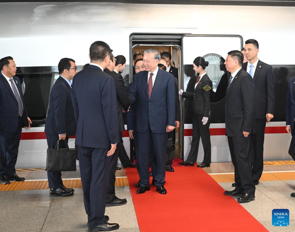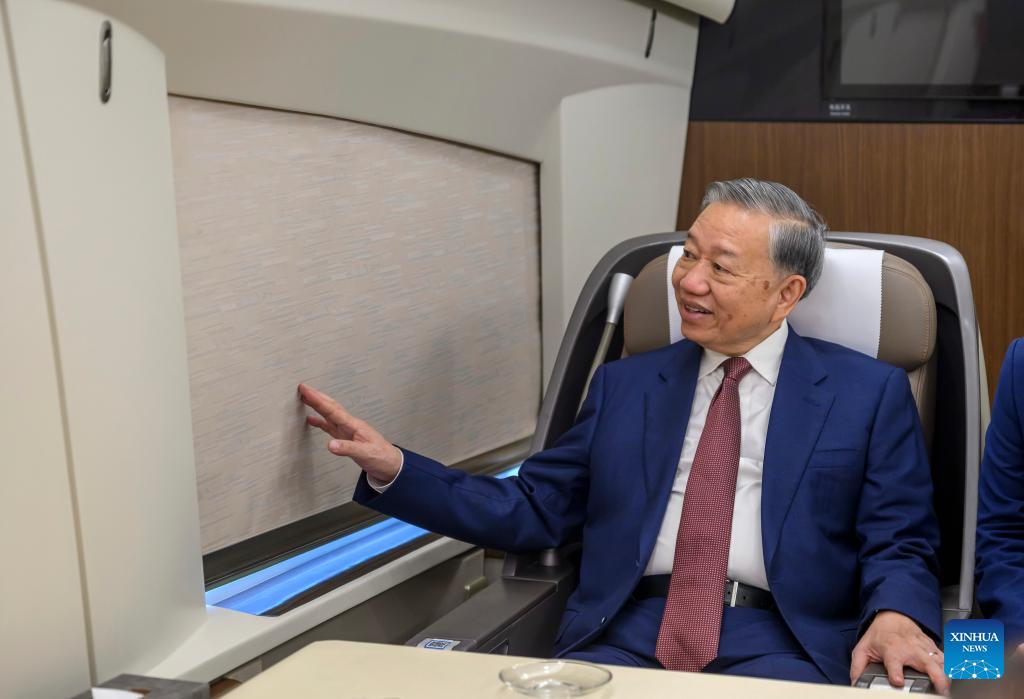To Lam, general secretary of the Communist Party of Vietnam Central Committee and president of Vietnam, takes a high-speed train to Xiong'an New Area of north China's Hebei Province on April 14, 2026.