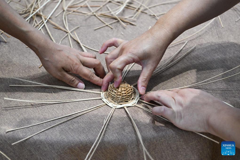 Visitors try rattan weaving during the sixth China International Consumer Products Expo (CICPE) in Haikou, south China's Hainan Province, April 15, 2026. From intangible cultural heritage skills to original IPs with traditional Chinese cultural characteristics, Chinese brands blend tradition with modernity and showcase their charm at the ongoing CICPE, attracting the attention of many visitors. (Xinhua/Xin Yuewei)