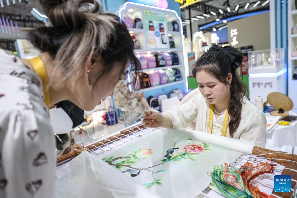 A visitor watches an exhibitor demonstrating Xiang embroidery stitching during the sixth China International Consumer Products Expo (CICPE) in Haikou, south China's Hainan Province, April 14, 2026. From intangible cultural heritage skills to original IPs with traditional Chinese cultural characteristics, Chinese brands blend tradition with modernity and showcase their charm at the ongoing CICPE, attracting the attention of many visitors. (Xinhua/Zhang Liyun)