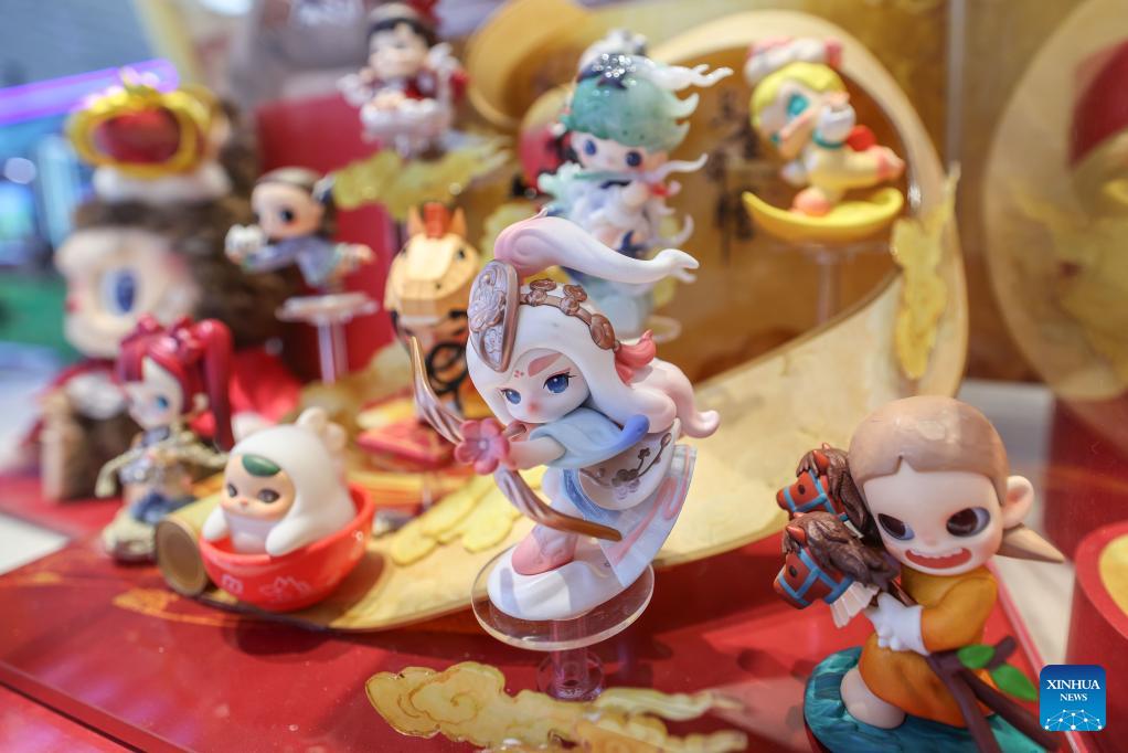 This photo taken on April 15, 2026 shows China-chic figurines at the sixth China International Consumer Products Expo (CICPE) in Haikou, south China's Hainan Province. From intangible cultural heritage skills to original IPs with traditional Chinese cultural characteristics, Chinese brands blend tradition with modernity and showcase their charm at the ongoing CICPE, attracting the attention of many visitors. (Xinhua/Xin Yuewei)