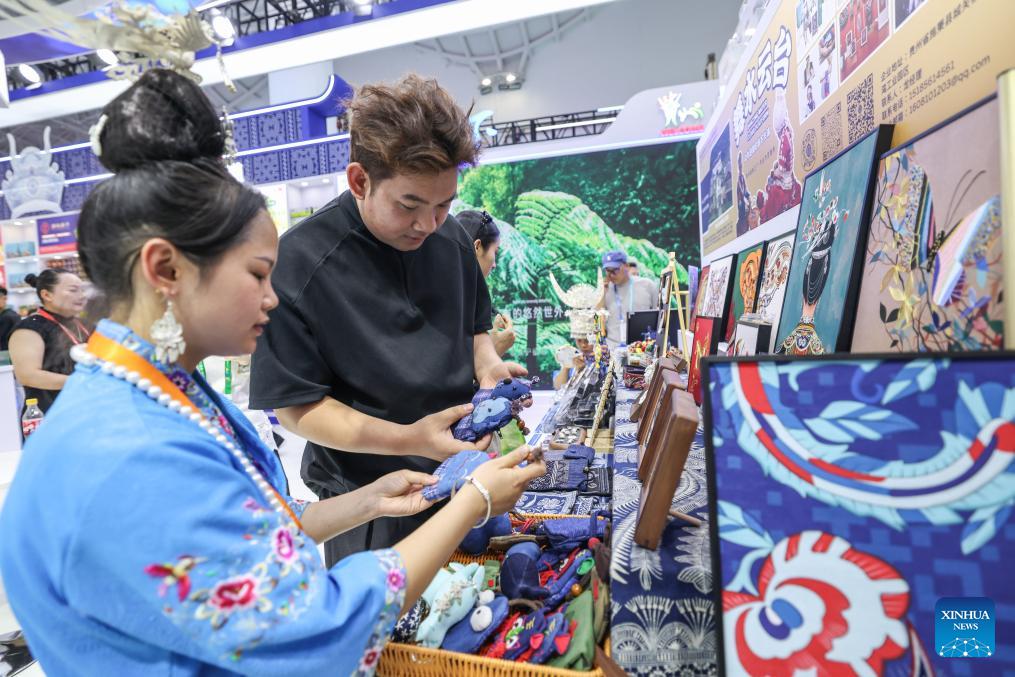 People look at Miao embroidery works during the sixth China International Consumer Products Expo (CICPE) in Haikou, south China's Hainan Province, April 14, 2026. From intangible cultural heritage skills to original IPs with traditional Chinese cultural characteristics, Chinese brands blend tradition with modernity and showcase their charm at the ongoing CICPE, attracting the attention of many visitors. (Xinhua/Zhang Liyun)
