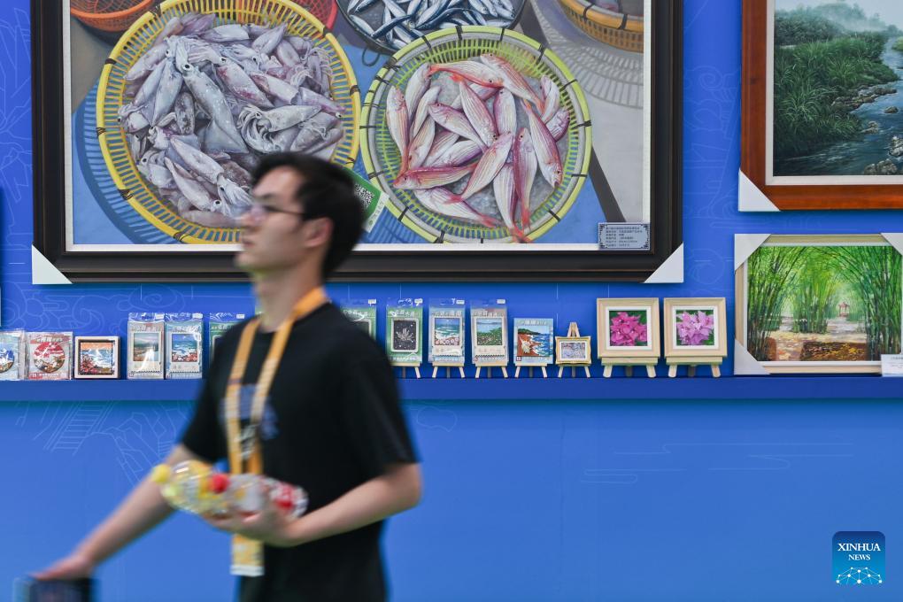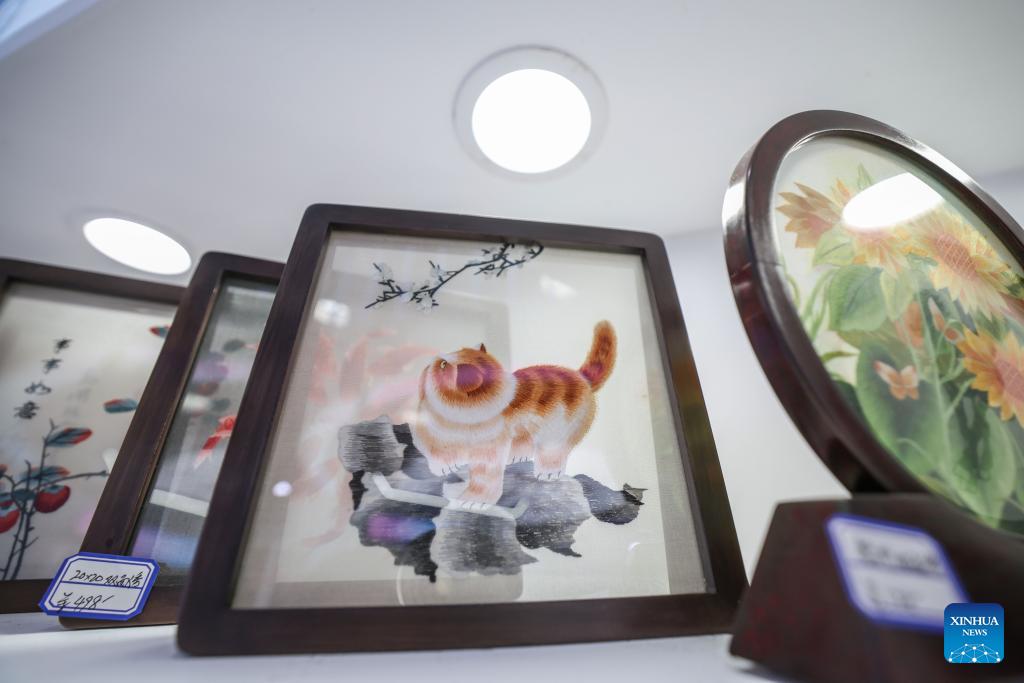 This photo taken on April 14, 2026 shows Xiang embroidery works at the sixth China International Consumer Products Expo (CICPE) in Haikou, south China's Hainan Province. From intangible cultural heritage skills to original IPs with traditional Chinese cultural characteristics, Chinese brands blend tradition with modernity and showcase their charm at the ongoing CICPE, attracting the attention of many visitors. (Xinhua/Zhang Liyun)