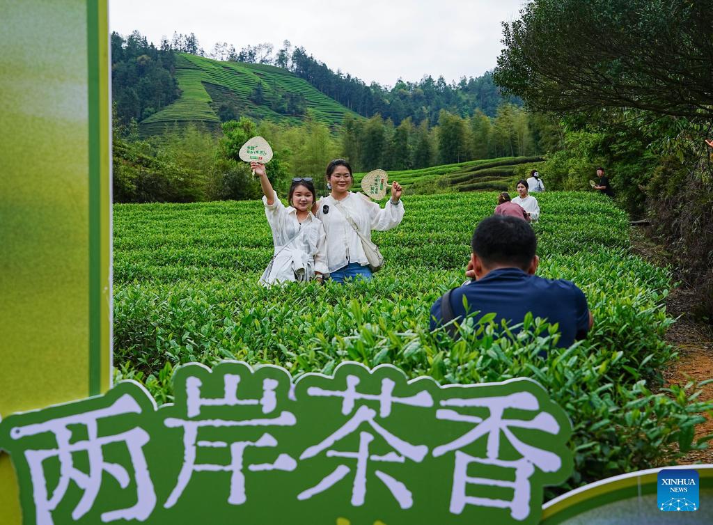 Tourists pose for photos during a cultural event at a tea garden in Xingcun Town, Wuyishan, southeast China's Fujian Province, April 15, 2026. (Photo by Chen Ying/Xinhua)