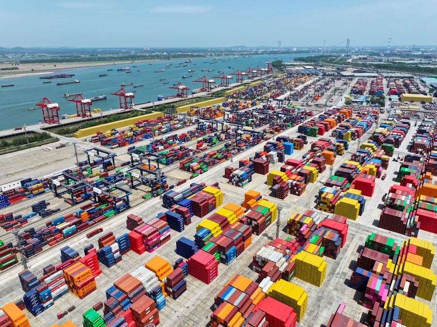 This aerial drone photo shows a view of the container terminal of Nanjing Port in east China's Jiangsu Province, April 16, 2025. (Photo: Xinhua)