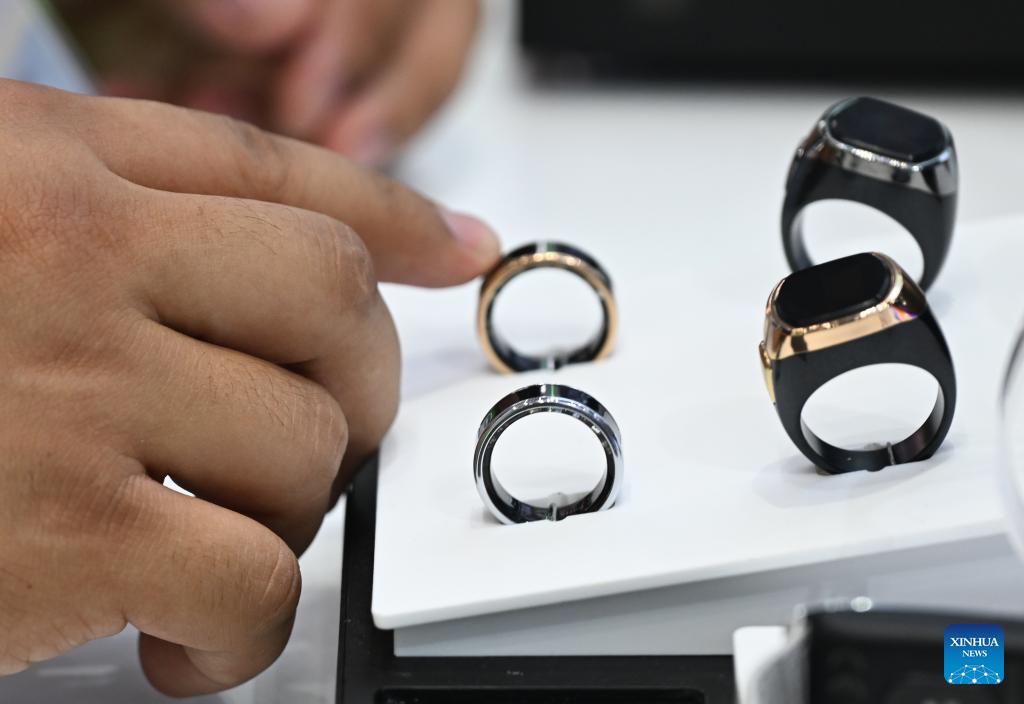 International buyers look at smart ring products at the 139th edition of the China Import and Export Fair in Guangzhou, south China's Guangdong Province, April 15, 2026. The 139th edition of the China Import and Export Fair, also known as the Canton Fair, opened here on Wednesday, drawing a record number of over 32,000 participating enterprises. (Xinhua/Deng Hua)