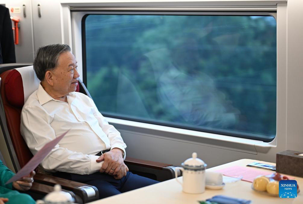 General Secretary of the Communist Party of Vietnam Central Committee and Vietnamese President To Lam, who is on a state visit to China, sits on a high-speed train on his way from Beijing, capital of China, to south China's Guangxi Zhuang Autonomous Region, April 16, 2026. (Xinhua/Dai Tianfang)