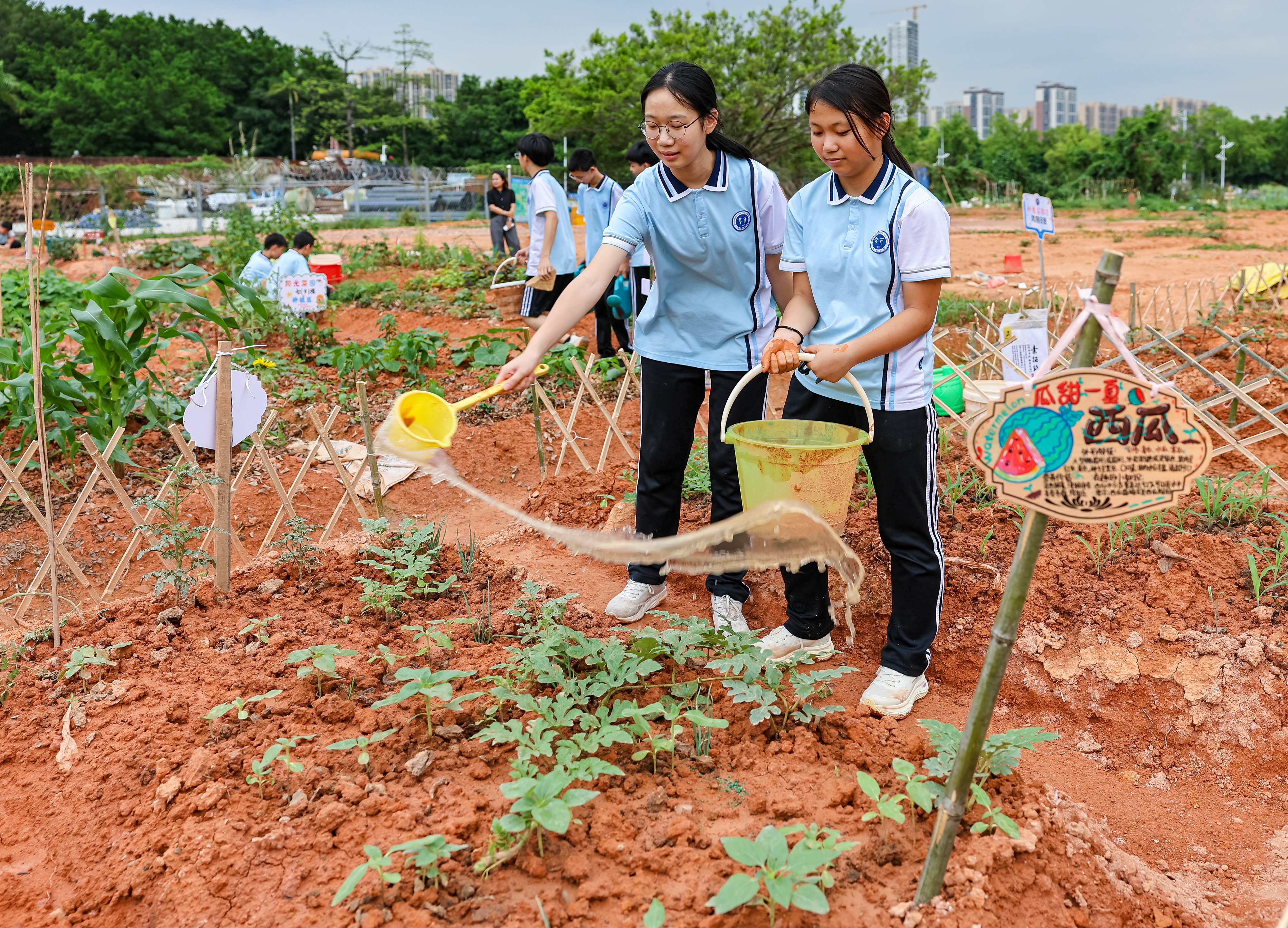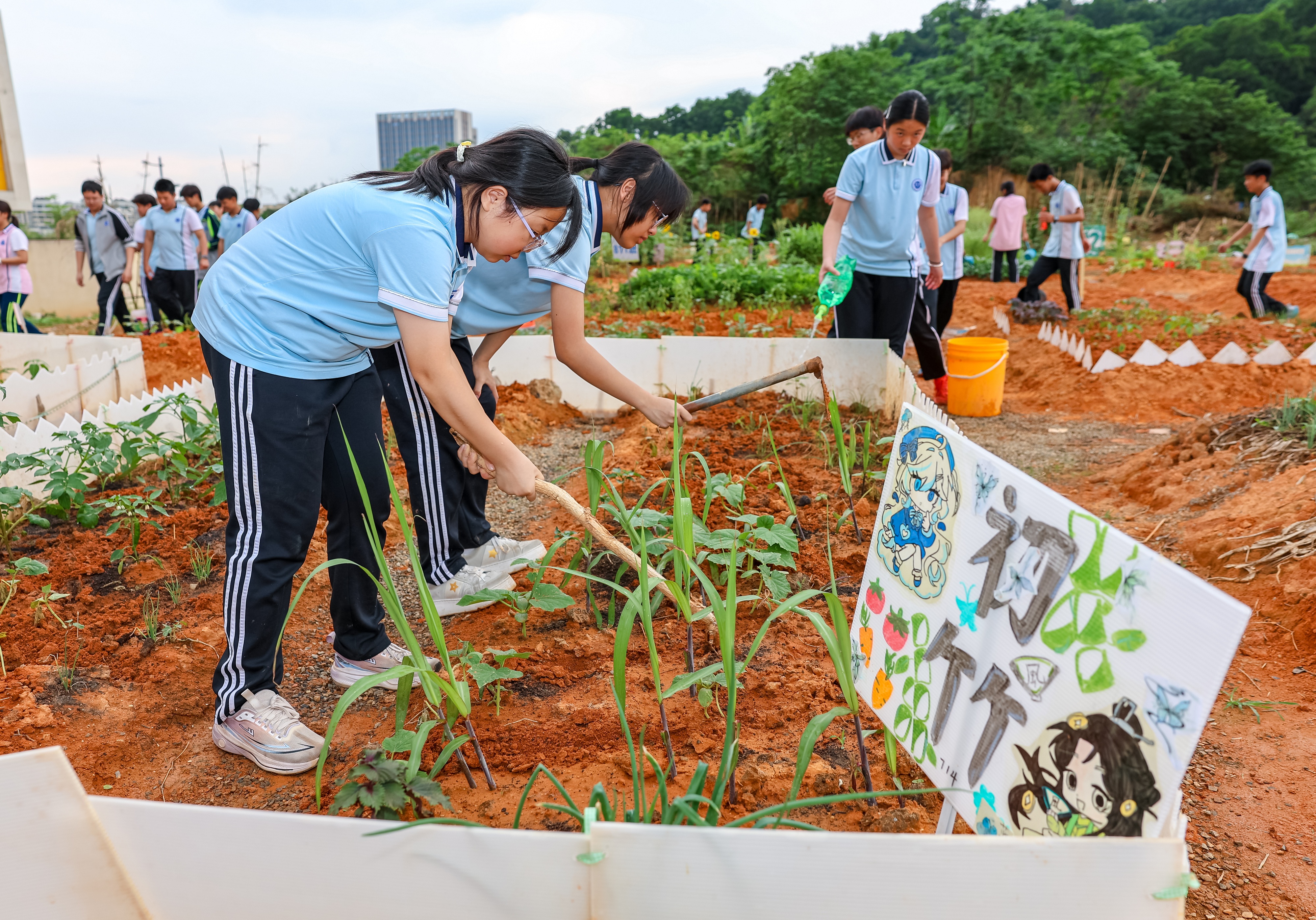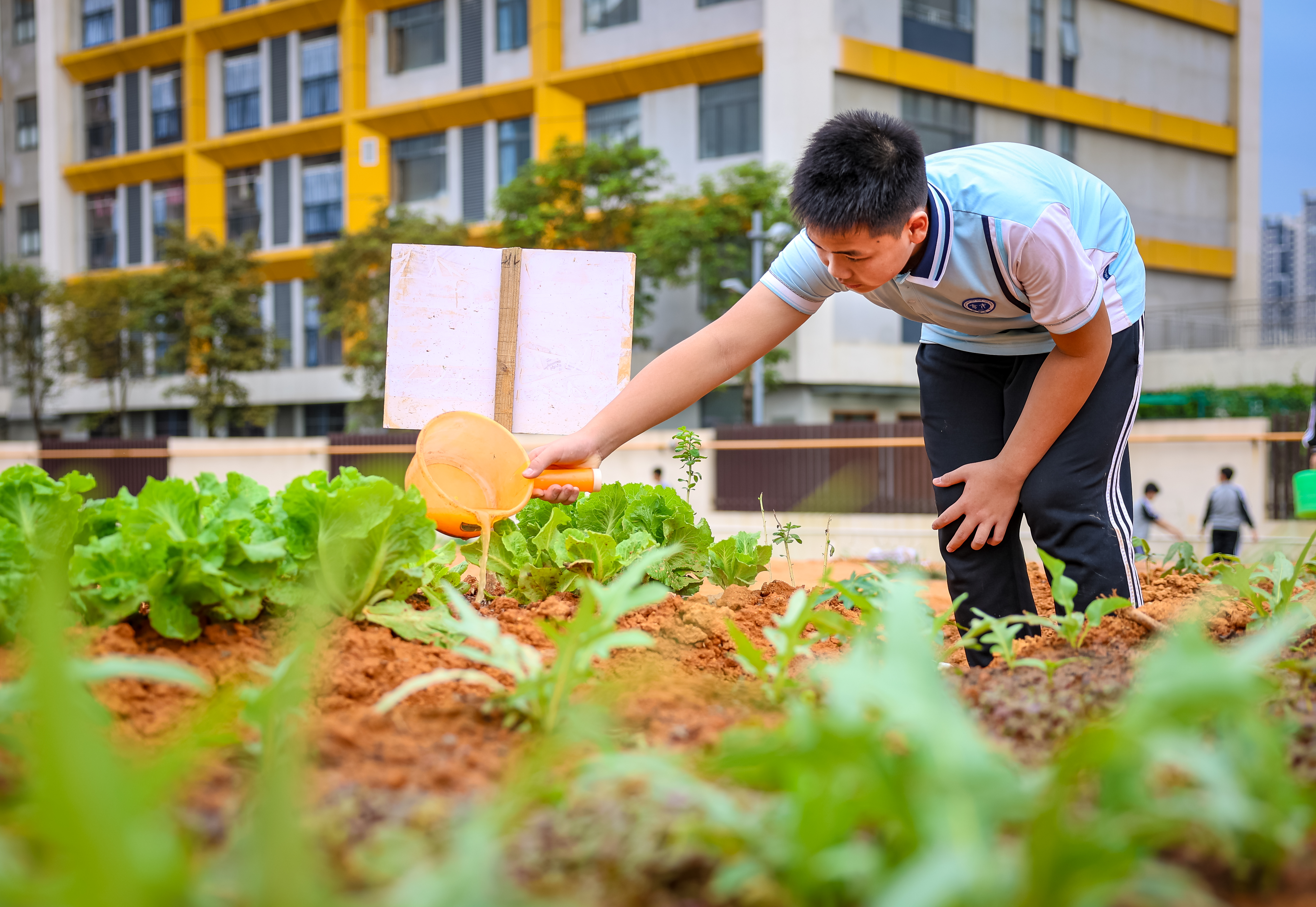 Hundreds of students from Zhaoqing High-tech Zone's Yucai School worked at the school's labor practice base, watering plants, tending soil and harvesting vegetables.