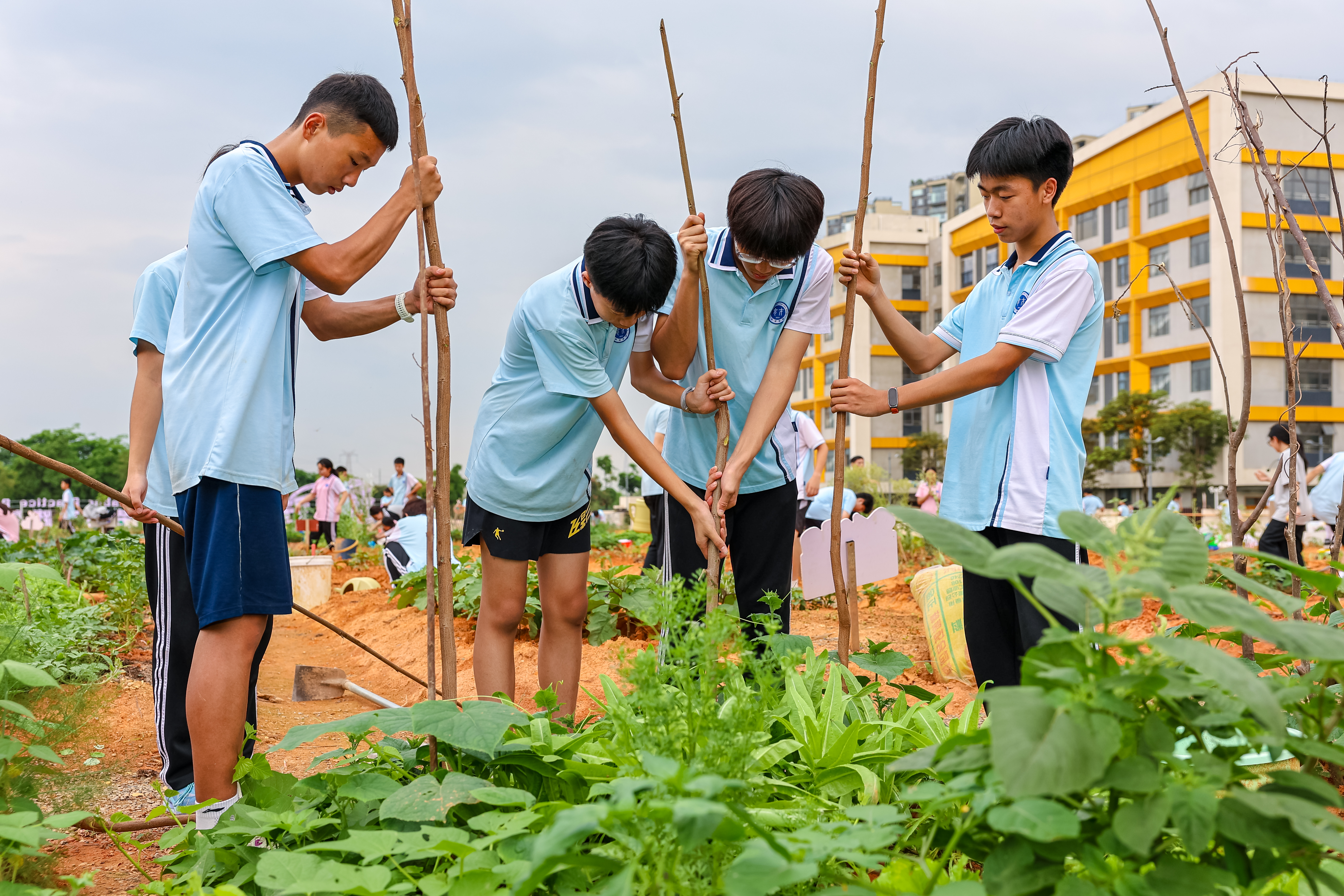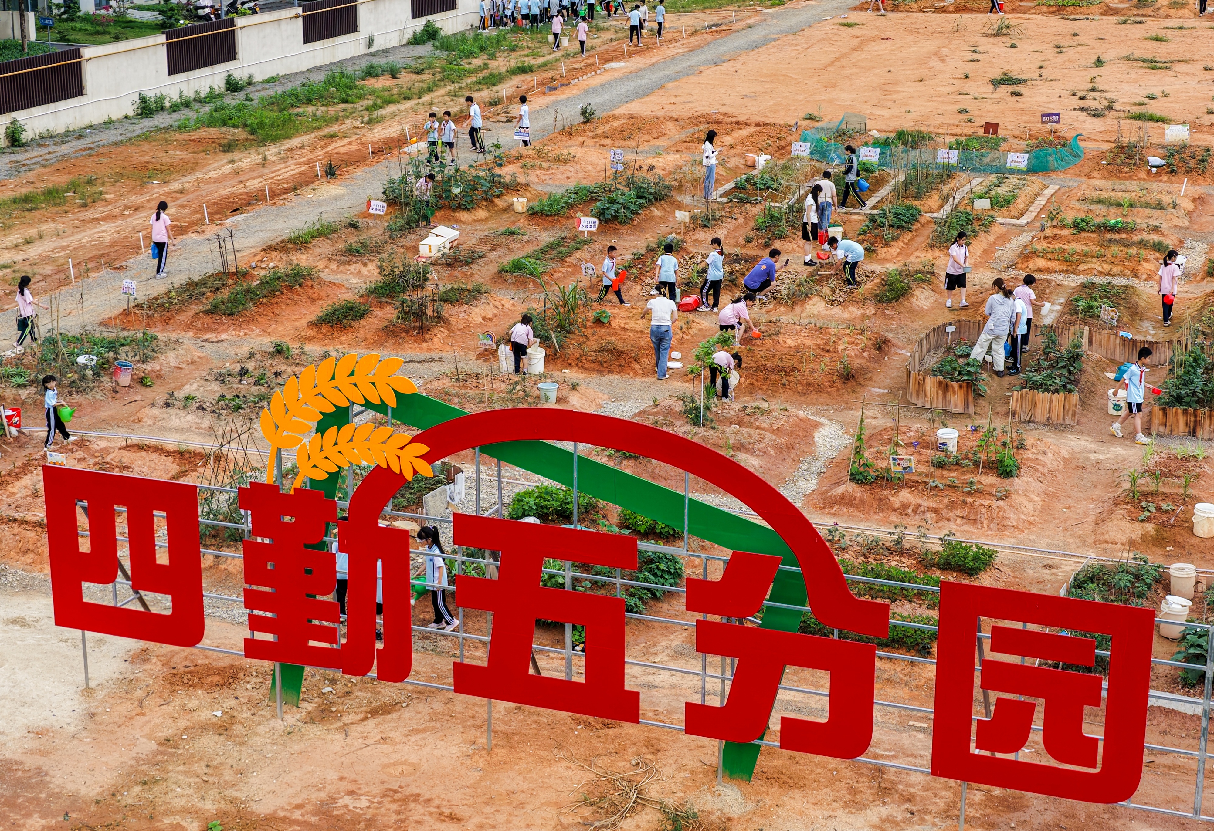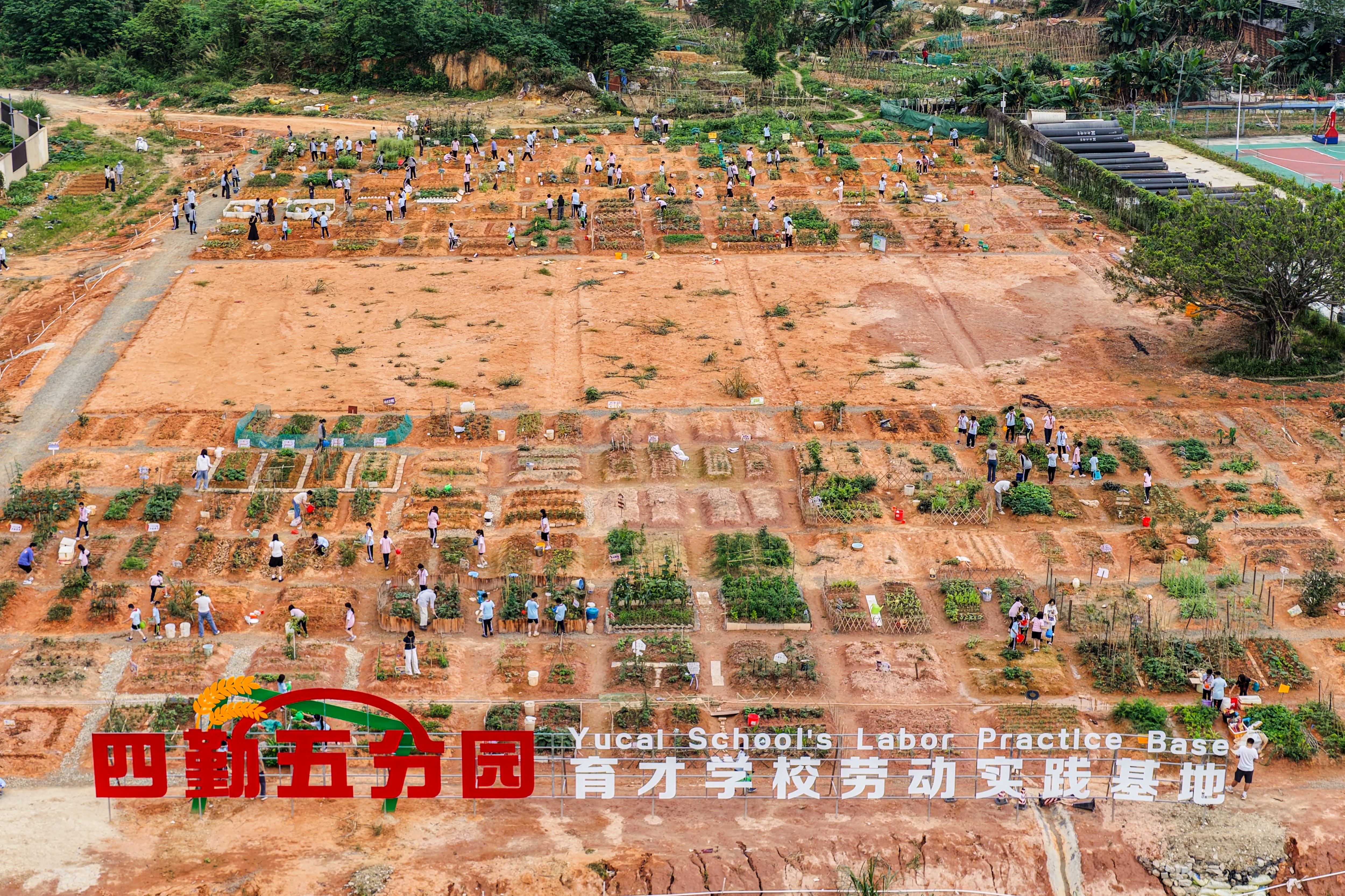 Hundreds of students from Zhaoqing High-tech Zone's Yucai School worked at the school's labor practice base, watering plants, tending soil and harvesting vegetables.