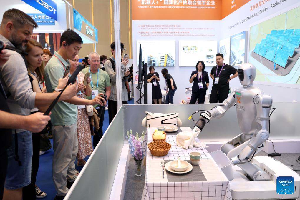 People look at a humanoid robot cleaning a table at the 139th edition of the China Import and Export Fair in Guangzhou, south China's Guangdong Province, April 15, 2026. The 139th edition of the China Import and Export Fair, also known as the Canton Fair, opened here on Wednesday. An exhibition area for service robots is set up at the event, bringing together 46 enterprises to showcase technological innovations and application capabilities in China's service robot sector. (Xinhua/Lu Hanxin)