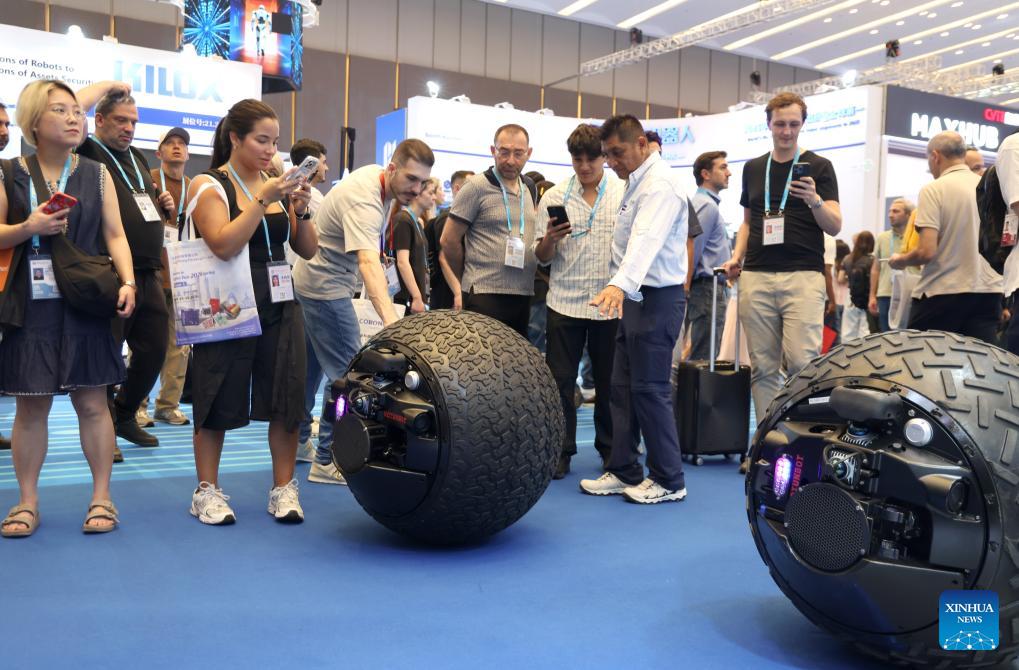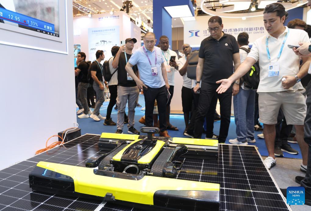 Visitors look at a photovoltaic panel cleaning robot at the 139th edition of the China Import and Export Fair in Guangzhou, south China's Guangdong Province, April 15, 2026. The 139th edition of the China Import and Export Fair, also known as the Canton Fair, opened here on Wednesday. An exhibition area for service robots is set up at the event, bringing together 46 enterprises to showcase technological innovations and application capabilities in China's service robot sector. (Xinhua/Lu Hanxin)