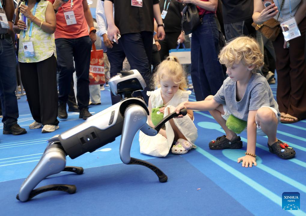 A child shakes hand with a robot dog at the 139th edition of the China Import and Export Fair in Guangzhou, south China's Guangdong Province, April 15, 2026. The 139th edition of the China Import and Export Fair, also known as the Canton Fair, opened here on Wednesday. An exhibition area for service robots is set up at the event, bringing together 46 enterprises to showcase technological innovations and application capabilities in China's service robot sector. (Xinhua/Lu Hanxin)