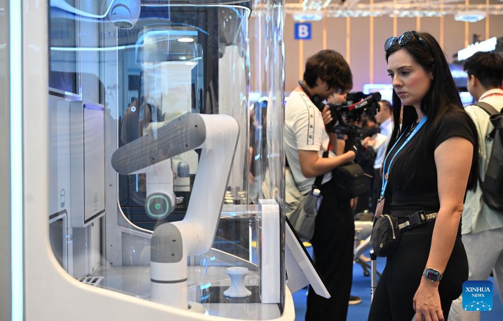 A visitor looks at an ice cream making robot at the 139th edition of the China Import and Export Fair in Guangzhou, south China's Guangdong Province, April 15, 2026. The 139th edition of the China Import and Export Fair, also known as the Canton Fair, opened here on Wednesday. An exhibition area for service robots is set up at the event, bringing together 46 enterprises to showcase technological innovations and application capabilities in China's service robot sector. (Xinhua/Deng Hua)