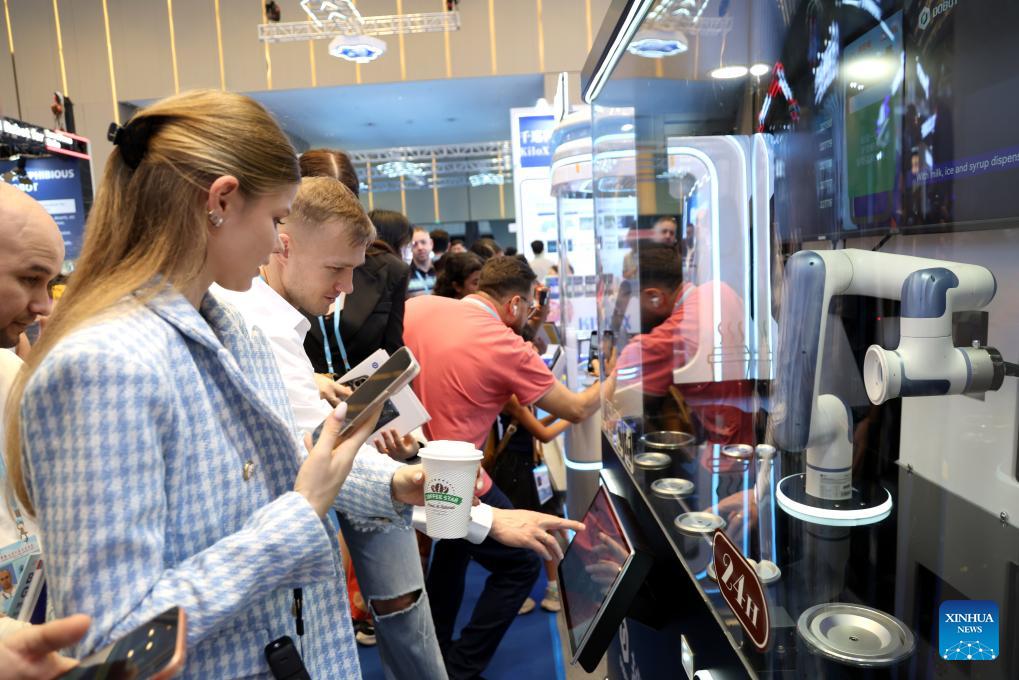 People try a coffee making robot at the 139th edition of the China Import and Export Fair in Guangzhou, south China's Guangdong Province, April 15, 2026. The 139th edition of the China Import and Export Fair, also known as the Canton Fair, opened here on Wednesday. An exhibition area for service robots is set up at the event, bringing together 46 enterprises to showcase technological innovations and application capabilities in China's service robot sector. (Xinhua/Lu Hanxin)