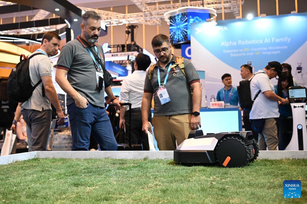 Visitors look at a weeding robot at the 139th edition of the China Import and Export Fair in Guangzhou, south China's Guangdong Province, April 15, 2026. The 139th edition of the China Import and Export Fair, also known as the Canton Fair, opened here on Wednesday. An exhibition area for service robots is set up at the event, bringing together 46 enterprises to showcase technological innovations and application capabilities in China's service robot sector. (Xinhua/Deng Hua)