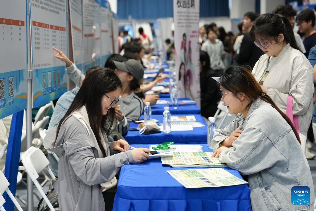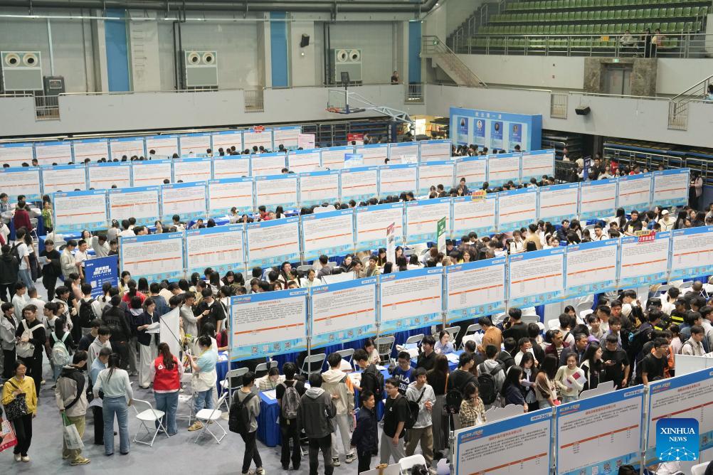 This photo taken on April 18, 2026 shows a scene at a job fair held at Hunan University in Changsha, central China's Hunan Province. The two-day job fair for university graduates kicked off on Saturday, with the main venues in Hunan University and Hunan Normal University. (Xinhua/Chen Zhenhai)