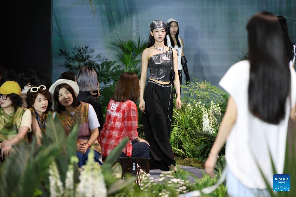 Models present creations on a fashion show during the 28th Straits Textile and Clothing Fair in Shishi, southeast China's Fujian Province, April 18, 2026. The fair kicked off here on Saturday. (Xinhua/Jiang Kehong)