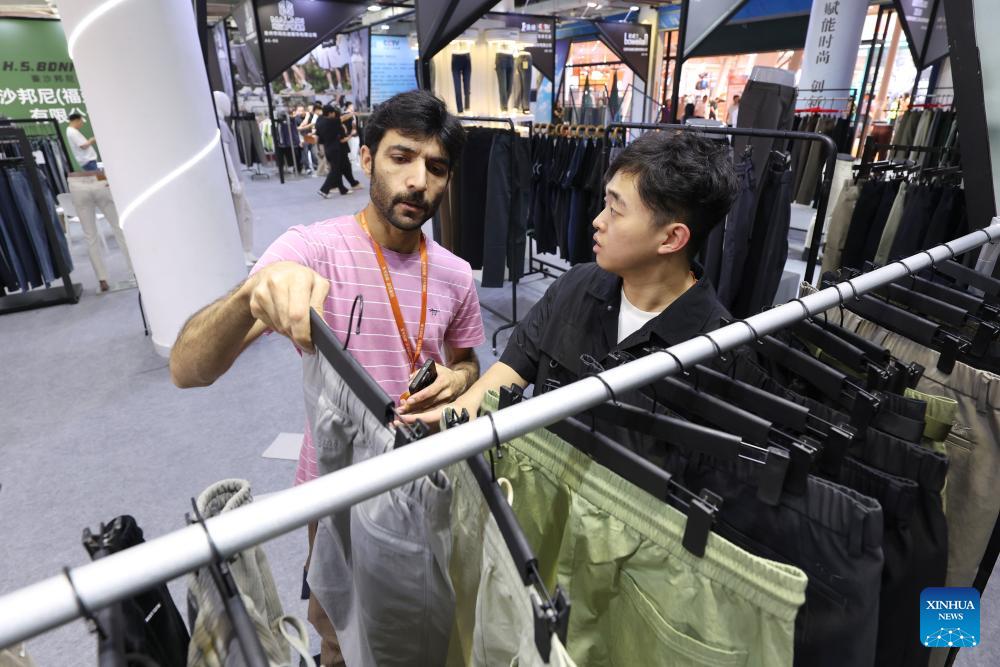 A foreign merchant talks with an exhibitor during the 28th Straits Textile and Clothing Fair in Shishi, southeast China's Fujian Province, April 18, 2026. The fair kicked off here on Saturday. (Xinhua/Jiang Kehong)