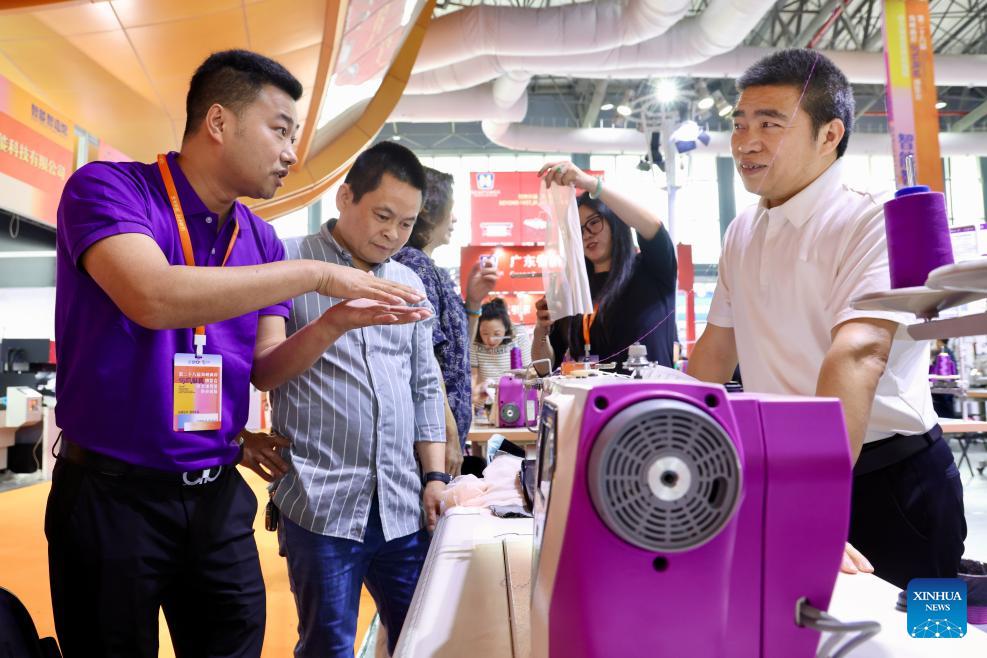 An exhibitor introduces a sewing machine to visitors during the 28th Straits Textile and Clothing Fair in Shishi, southeast China's Fujian Province, April 18, 2026. The fair kicked off here on Saturday. (Xinhua/Jiang Kehong)