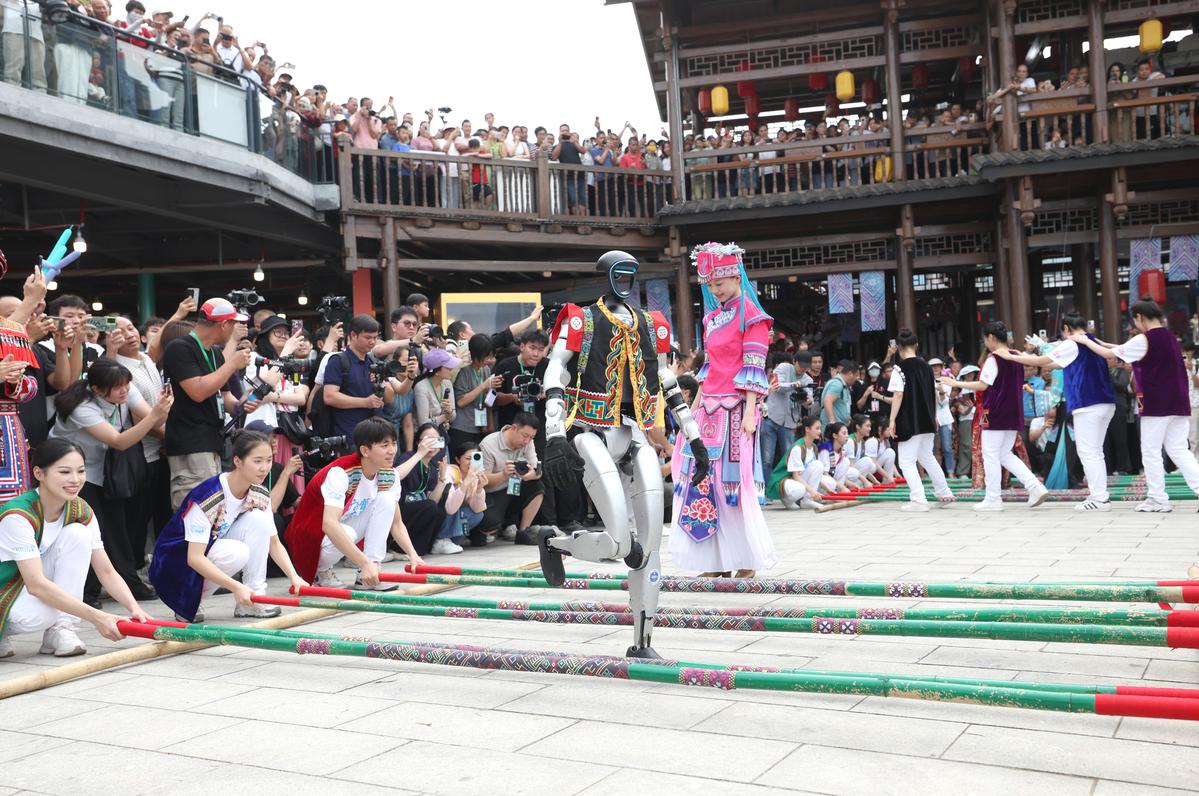 Humanoid robots and dancers perform the bamboo pole dancing together during the Sanyuesan Festival in Nanning, South China's Guangxi Zhuang autonomous region, on Friday. (Photo: chinadaily.com.cn)