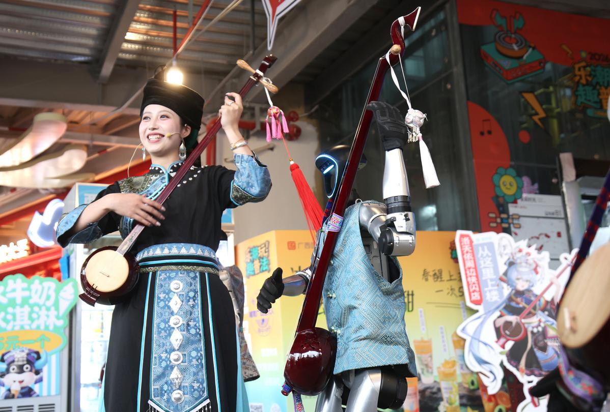 A humanoid robot and performers play ethnic musical instruments during the Sanyuesan Festival in Nanning, South China's Guangxi Zhuang autonomous region, on Saturday. (Photo: chinadaily.com.cn)